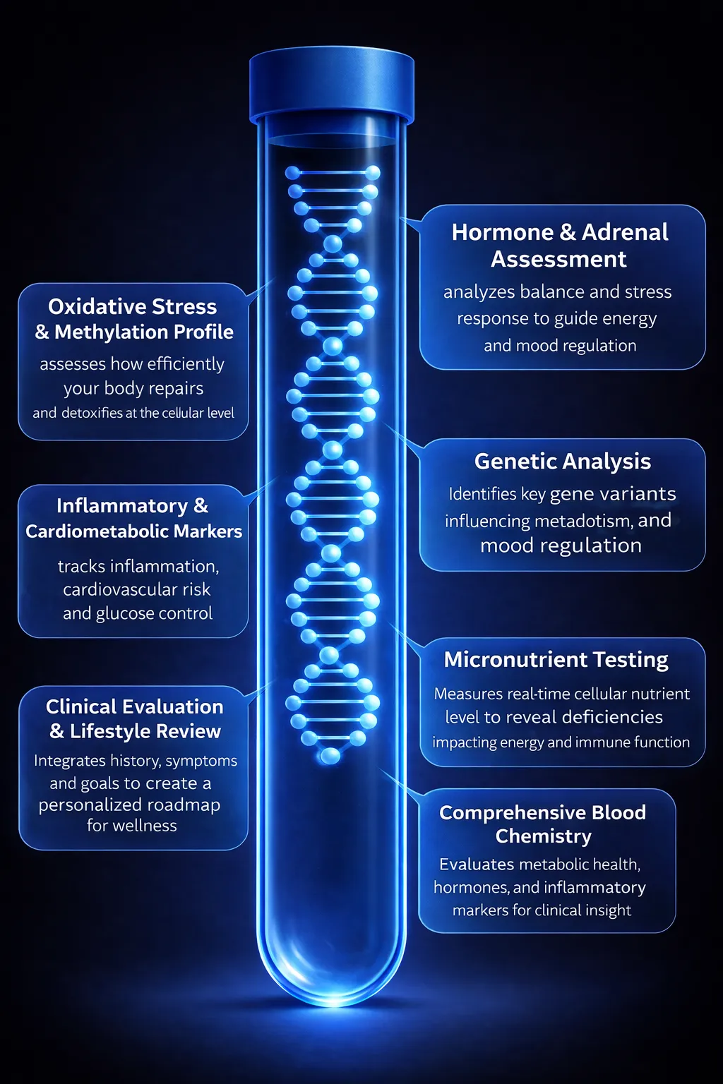 Your genes influence how you process nutrients, manage inflammation, build muscle, regulate hormones, and age. The Xcellment program evaluates genetic patterns in context — not in isolation — allowing us to design a strategy that works with your biology instead of against it. This is precision health guided by molecular intelligence.